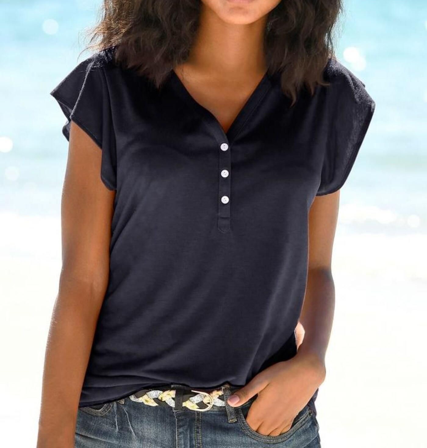 We offer a women’s T-shirt set of two pieces from the German brand Lascana, combining style, playfulness and femininity. The T-shirts feature flutter sleeves and neat front buttons: one with a subtle print, the other in a solid colour. The soft, flowing fabric highlights the figure and provides all-day comfort.