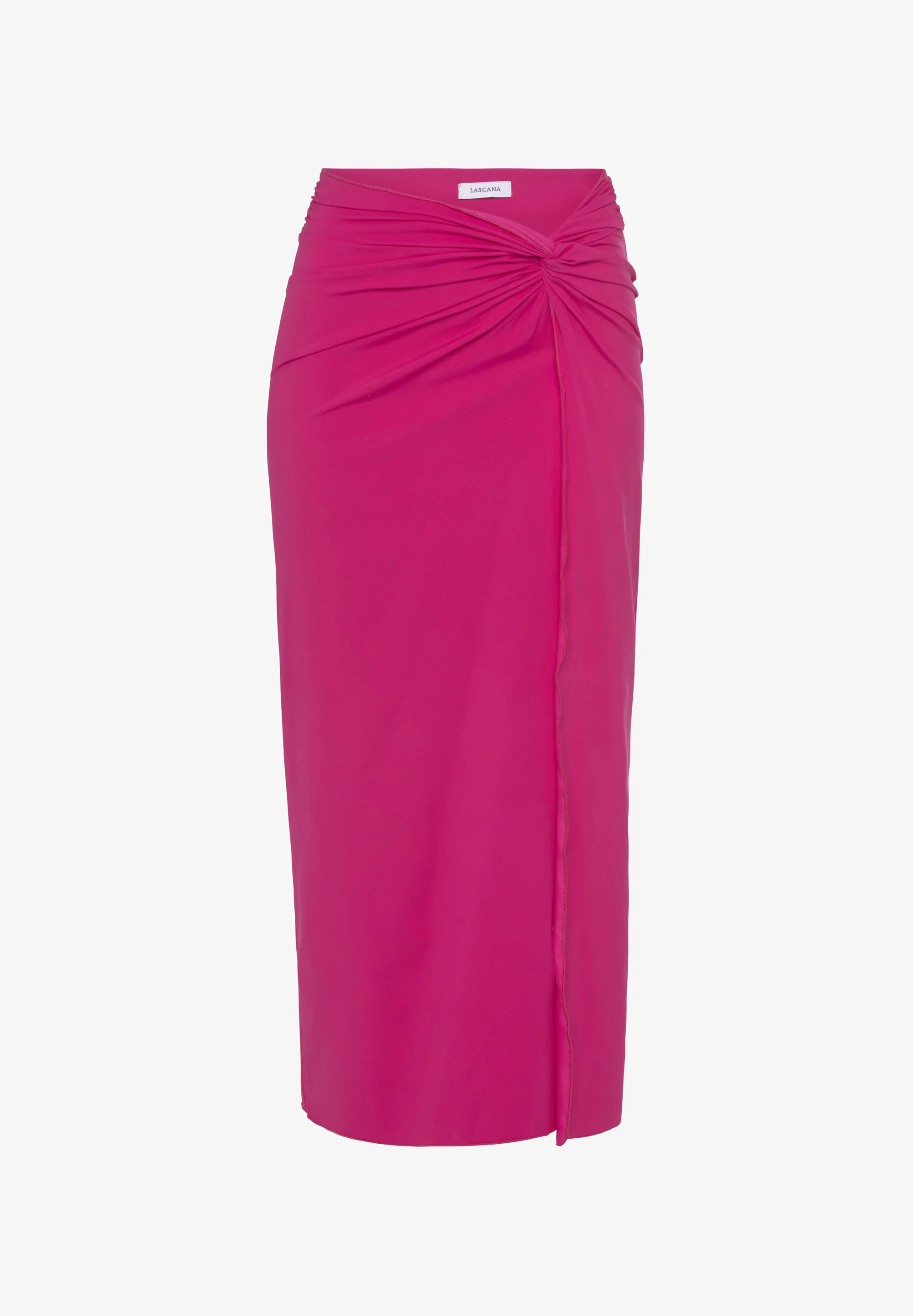 La jupe d'été-paréo de la marque allemande Lascana, dans un rose vif, met en valeur la silhouette et apporte une touche de couleur à la tenue.