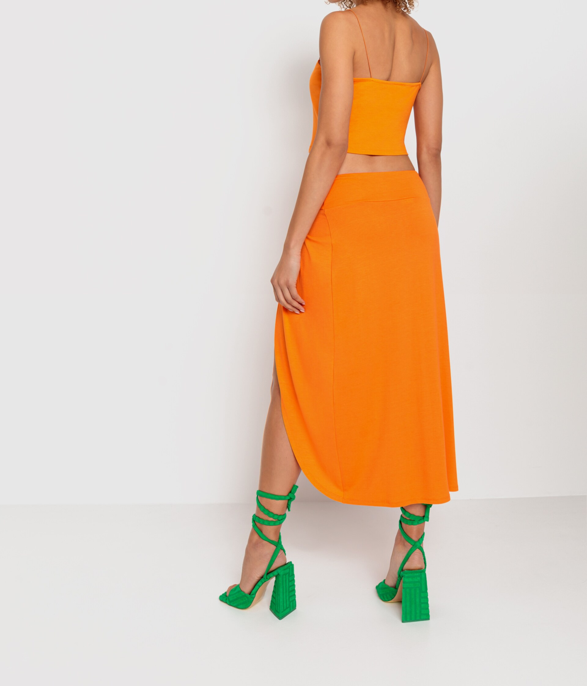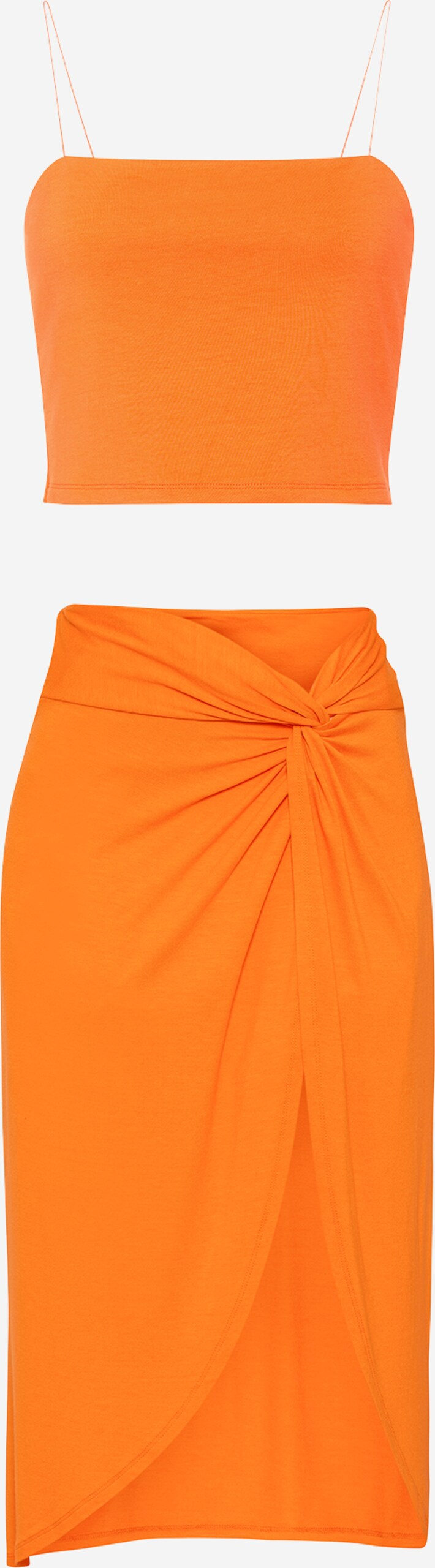 Le top à bretelles et la jupe avec fente asymétrique et effet noué créent un look audacieux et féminin. Le tissu est léger et respirant, idéal pour les vacances au bord de la mer et les promenades détendues.