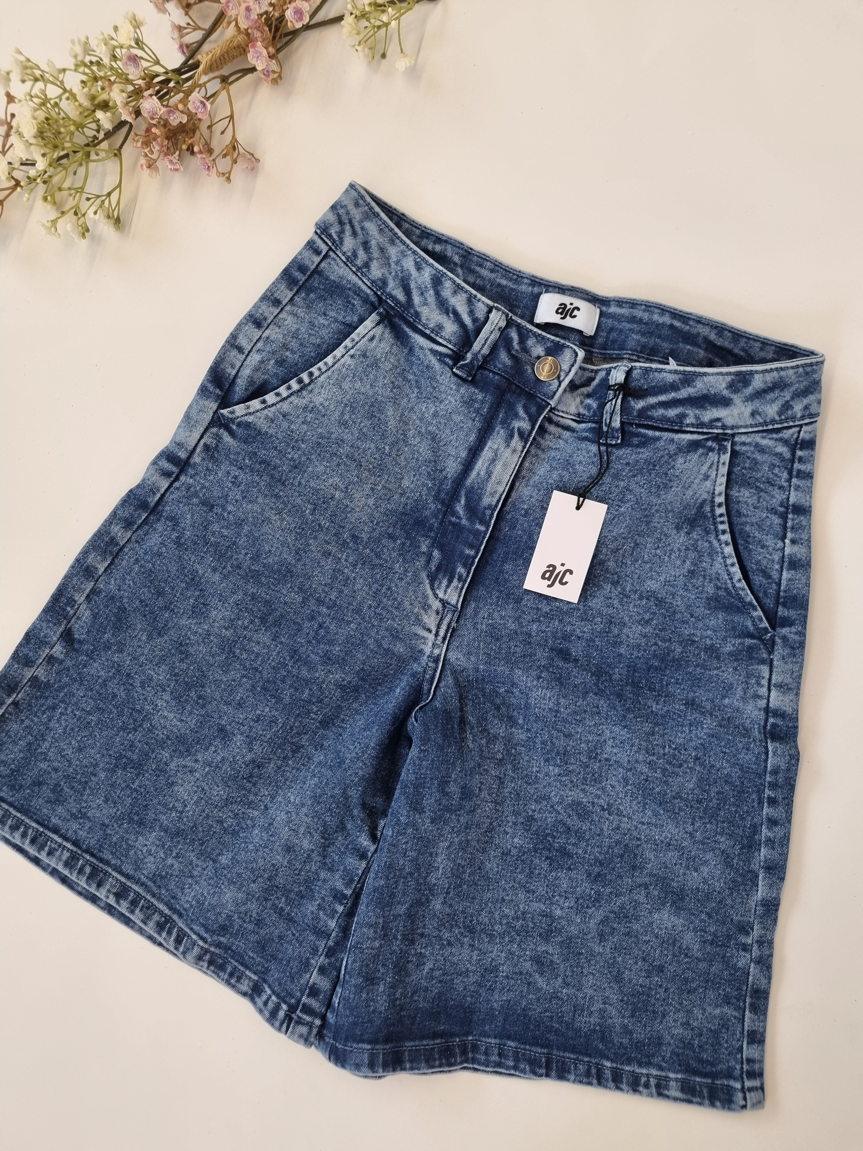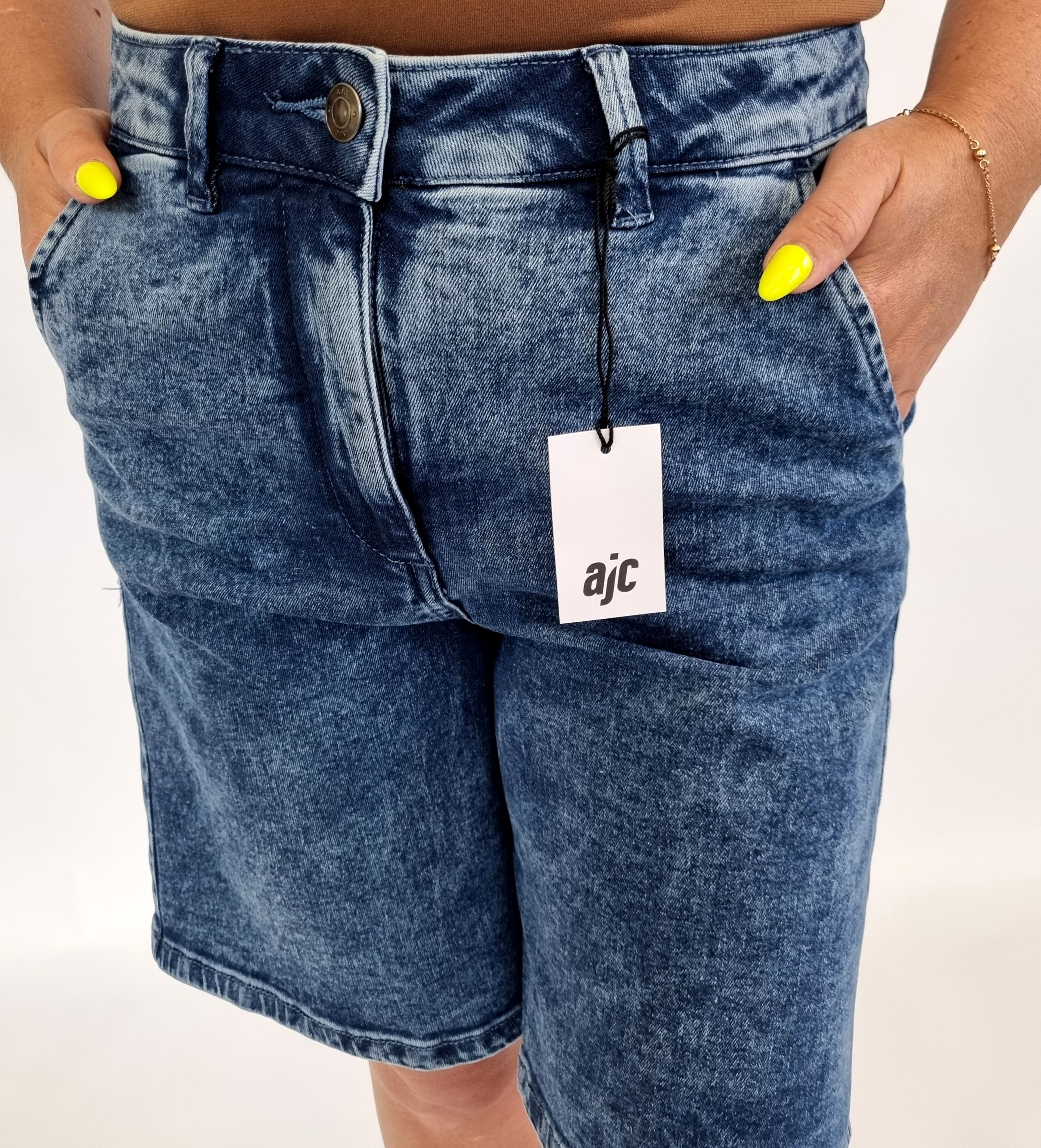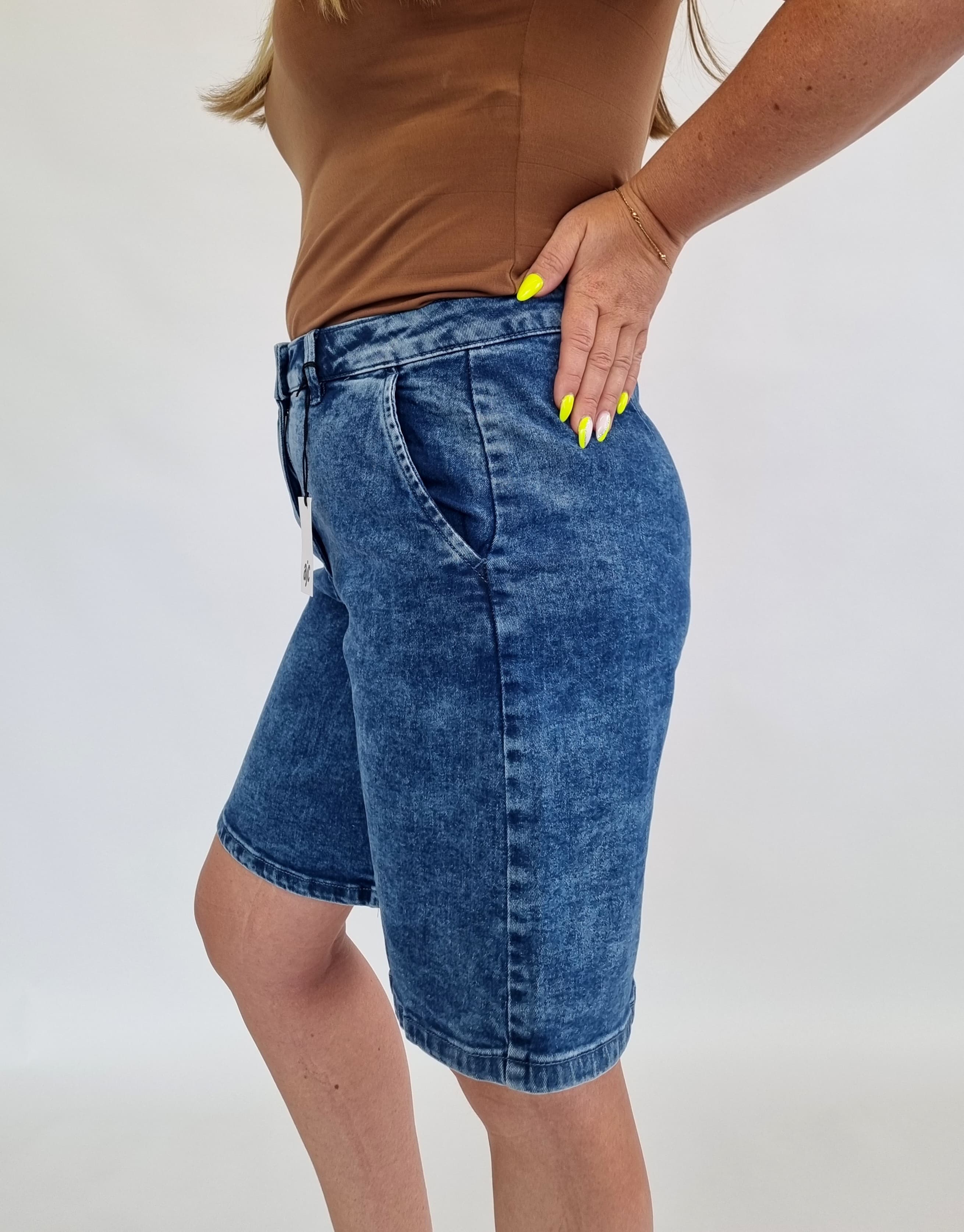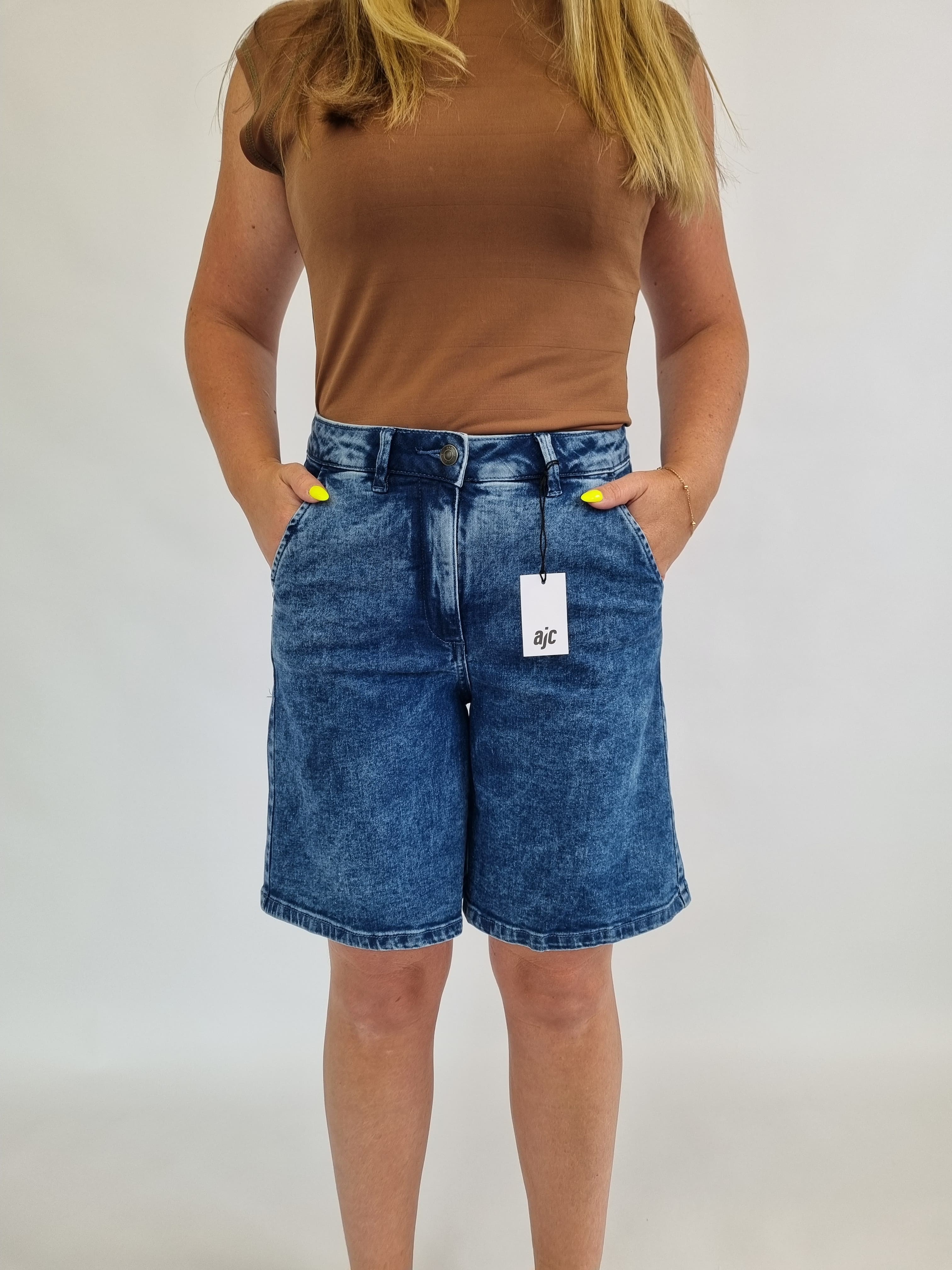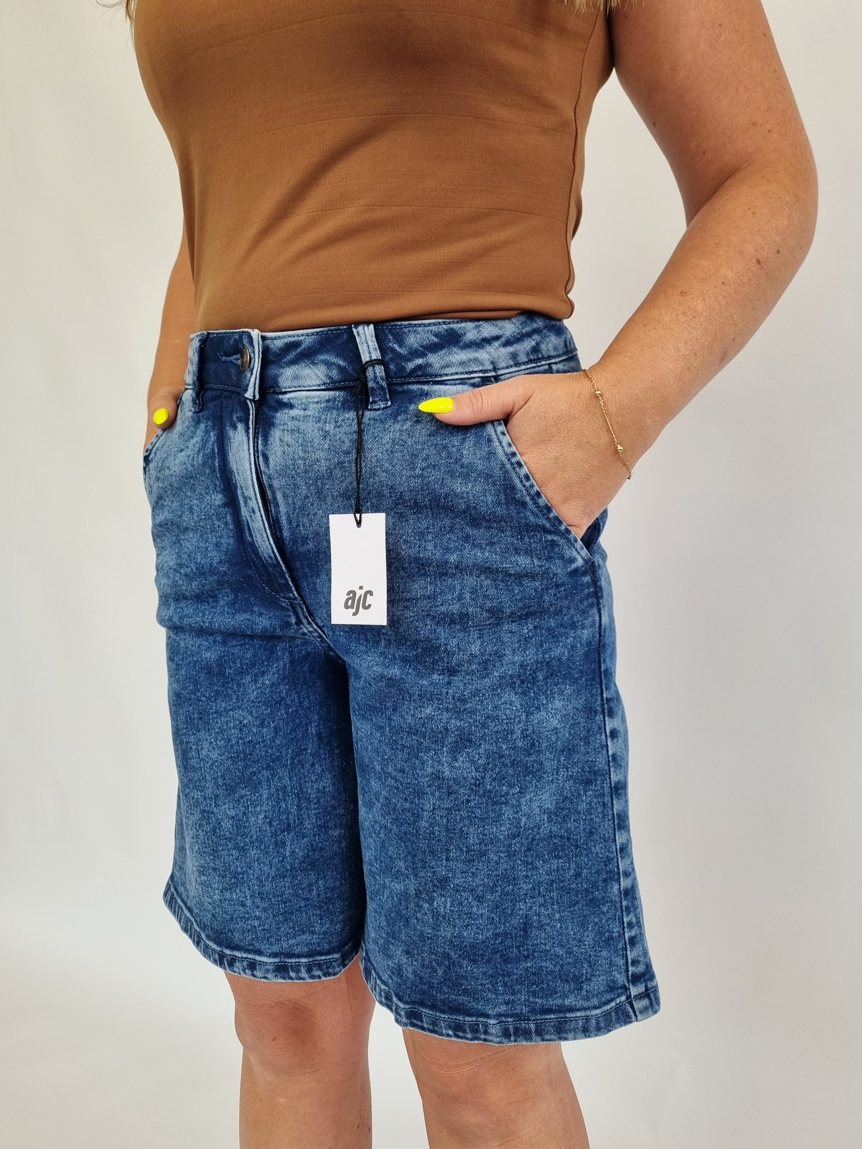Wir bieten leichte, modische und bequeme Damen-Jeans-Bermudashorts der deutschen Marke AJC an. Sie sind die perfekte Basis für sommerliche Outfits. Klassische Passform, trendige knielange Länge, drei tiefe Taschen und ein vielseitiger Blauton machen sie unverzichtbar.