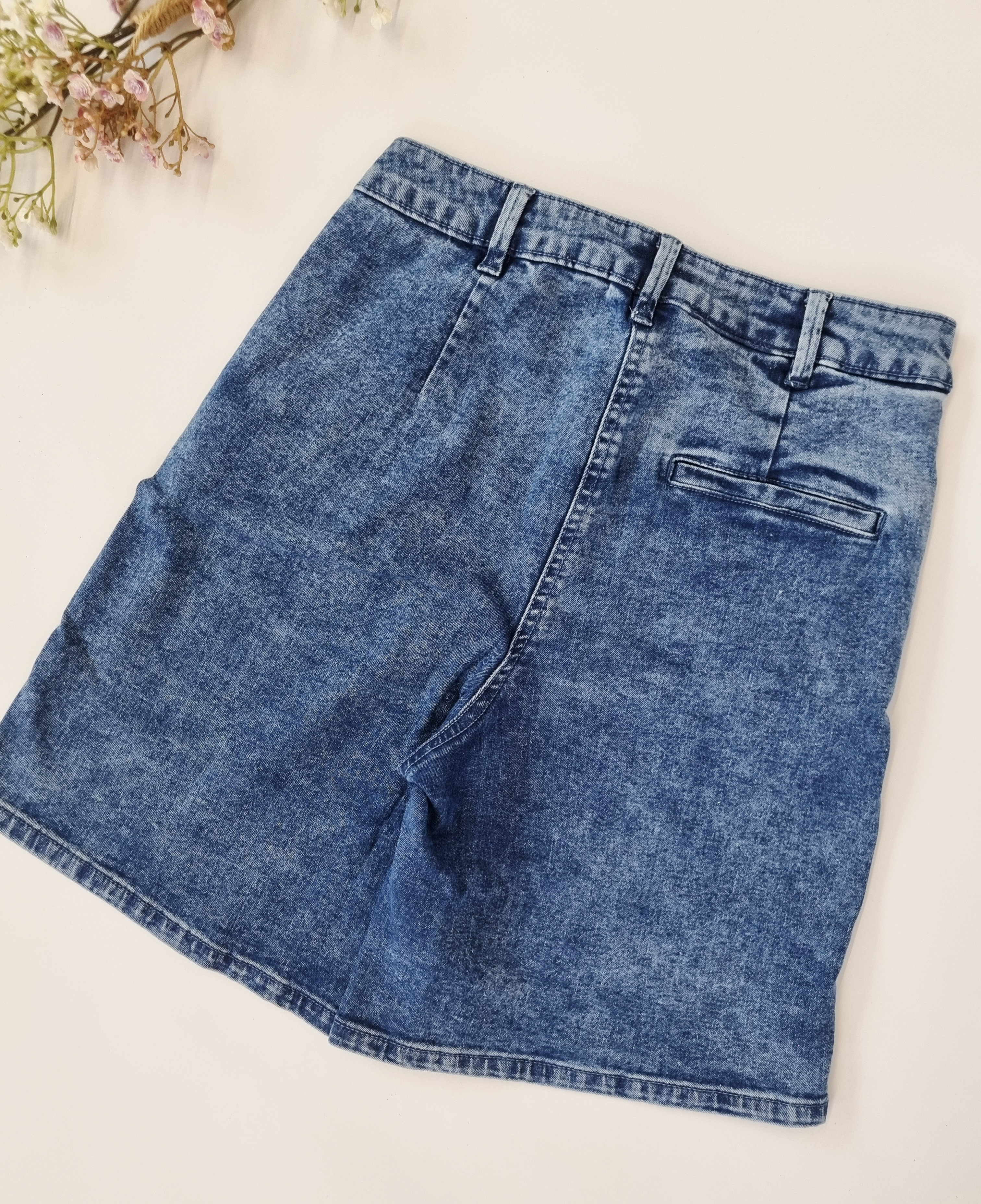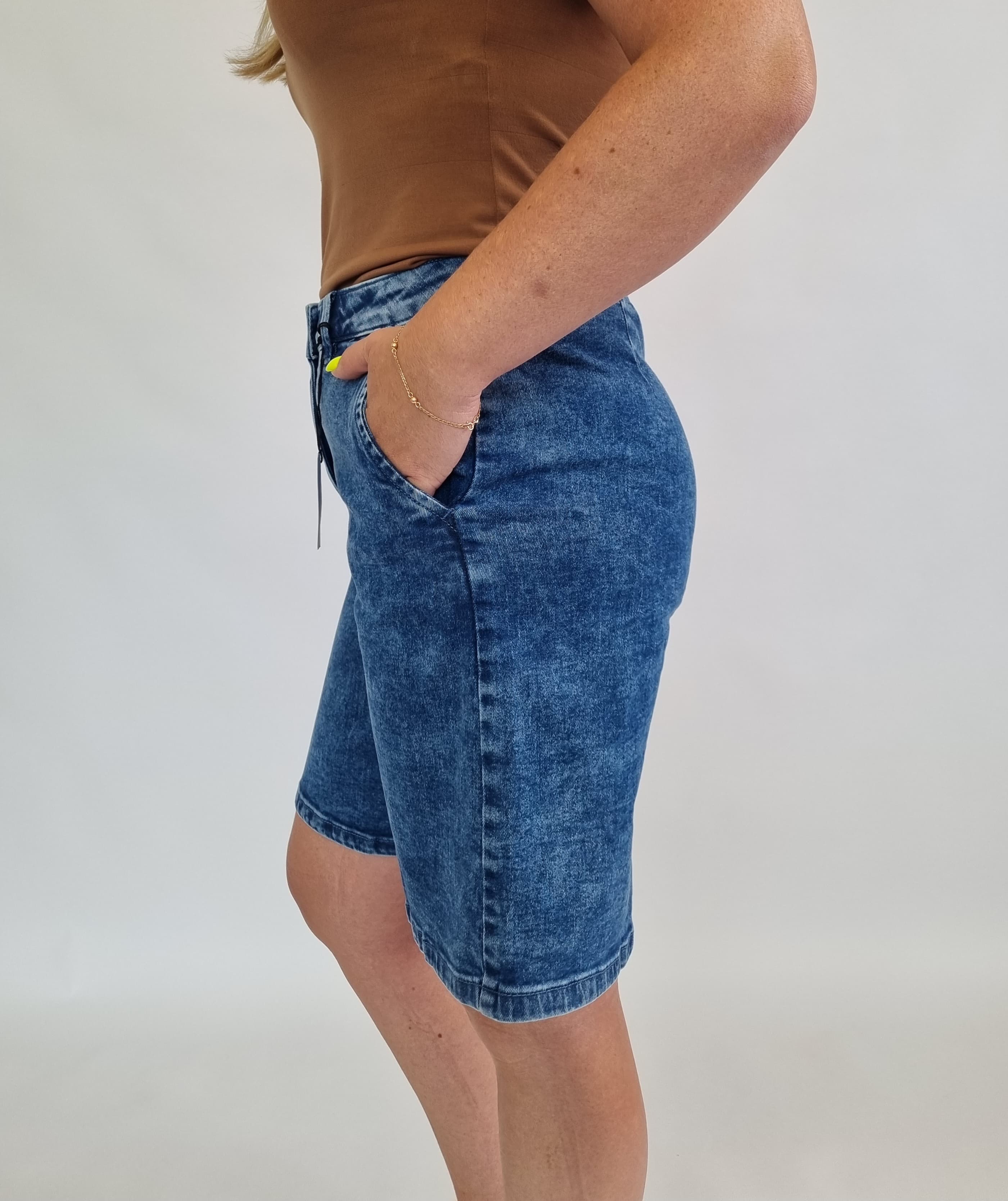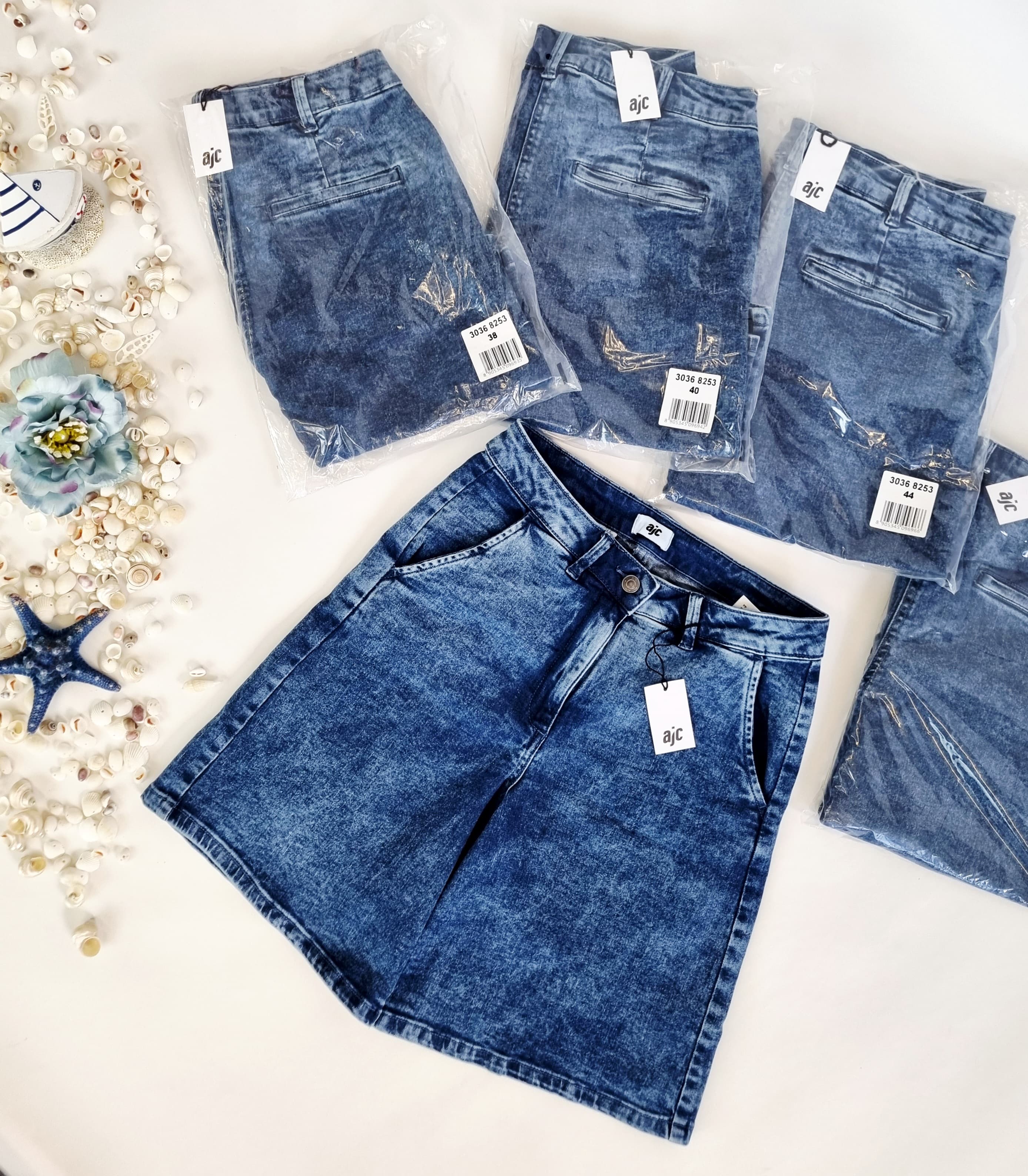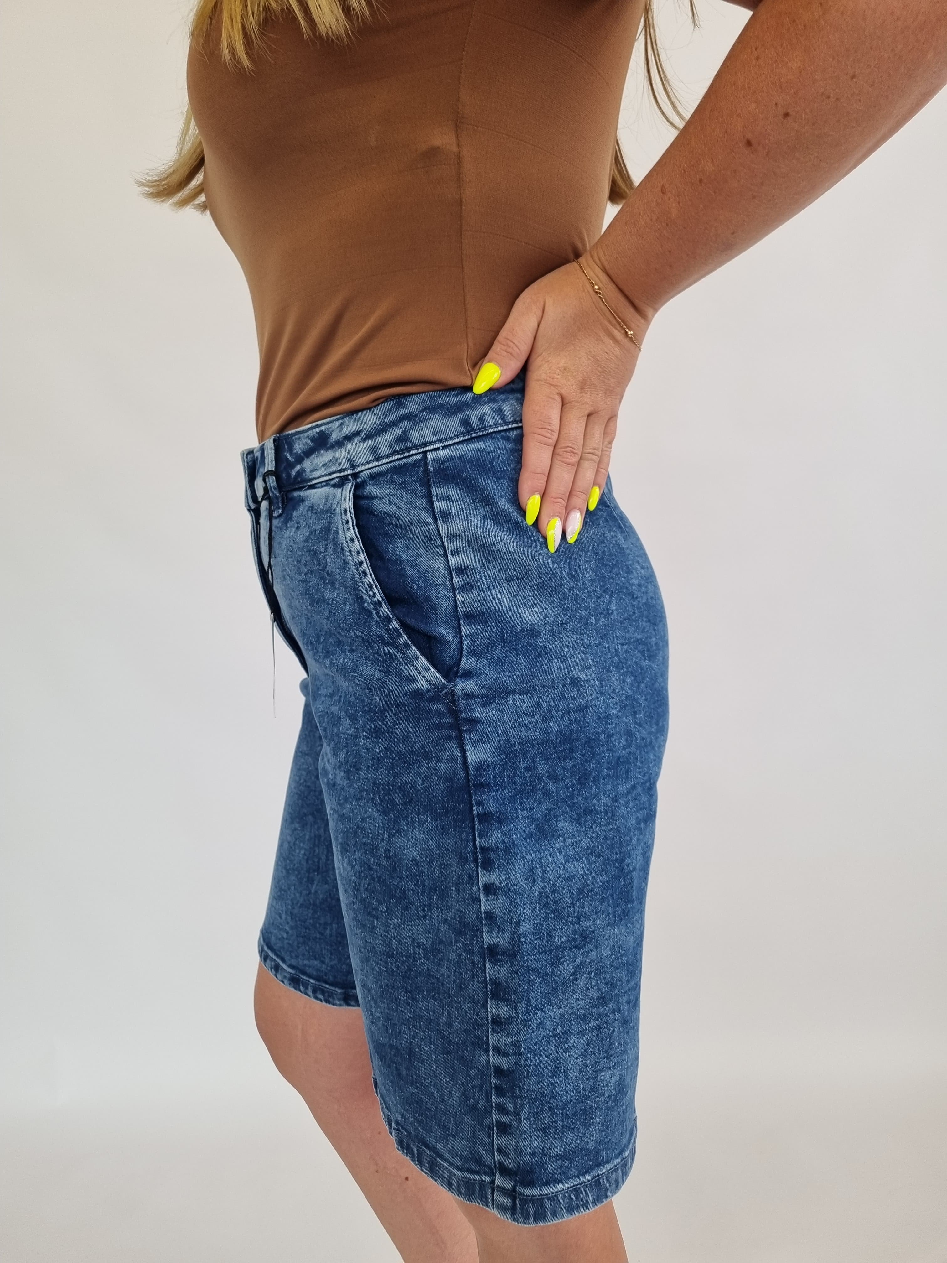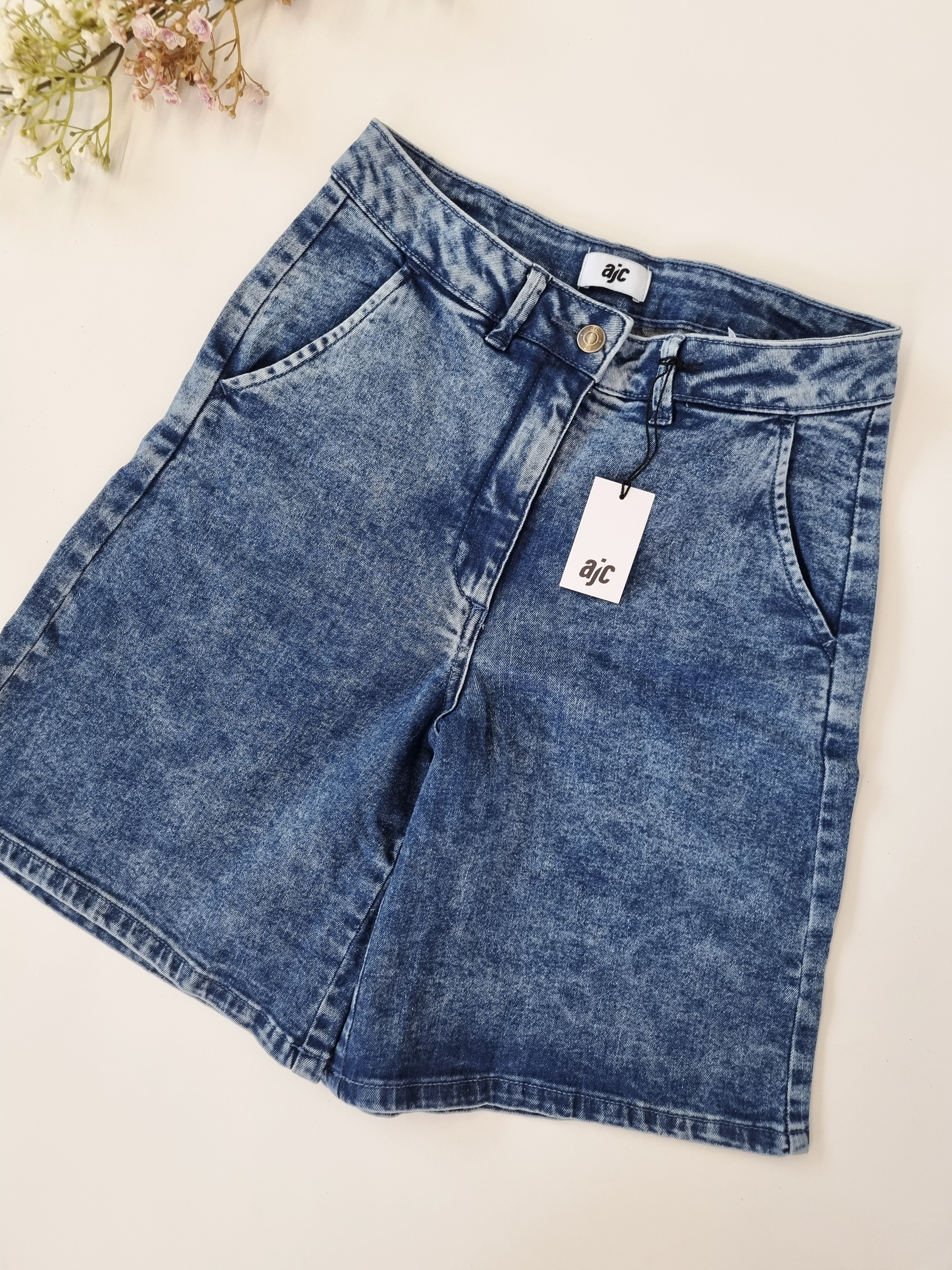 Wir bieten leichte, modische und bequeme Damen-Jeans-Bermudashorts der deutschen Marke AJC an. Sie sind die perfekte Basis für sommerliche Outfits. Klassische Passform, trendige knielange Länge, drei tiefe Taschen und ein vielseitiger Blauton machen sie unverzichtbar.
