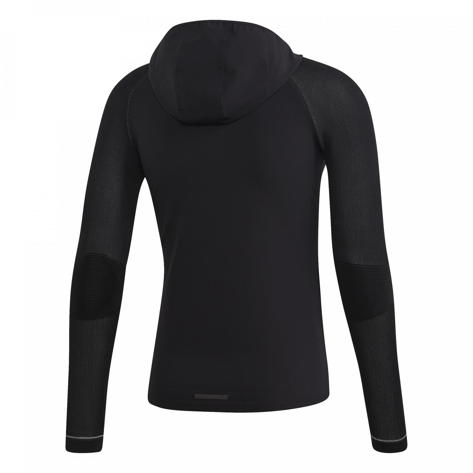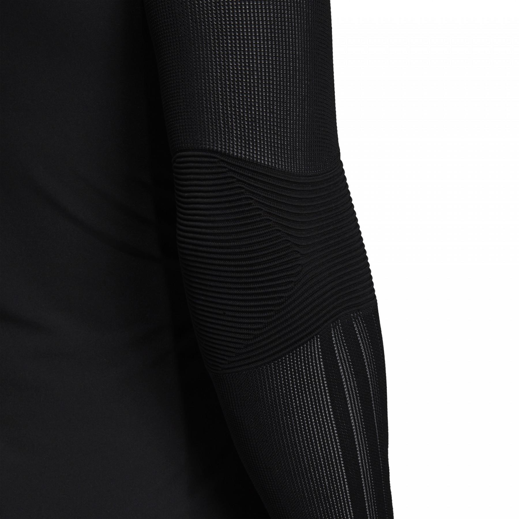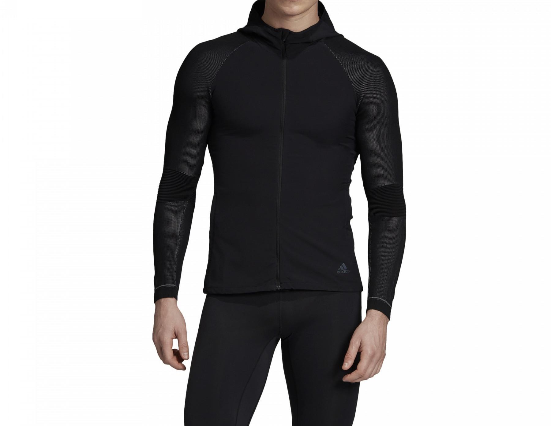 Featuring an ergonomic cut with articulated elbows, sleeves with elastic relief texture for extra comfort, an adjustable hood with drawstring, and zip pockets for safe storage.