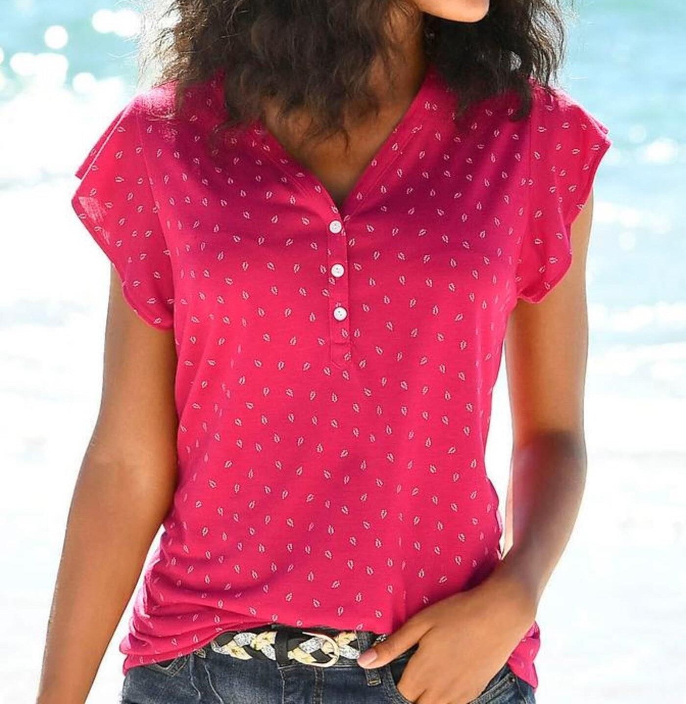 We offer a women’s T-shirt set of two pieces from the German brand Lascana, combining style, playfulness and femininity. The T-shirts feature flutter sleeves and neat front buttons: one with a subtle print, the other in a solid colour. The soft, flowing fabric highlights the figure and provides all-day comfort.
